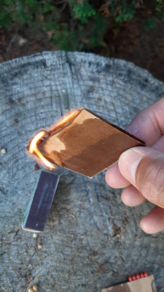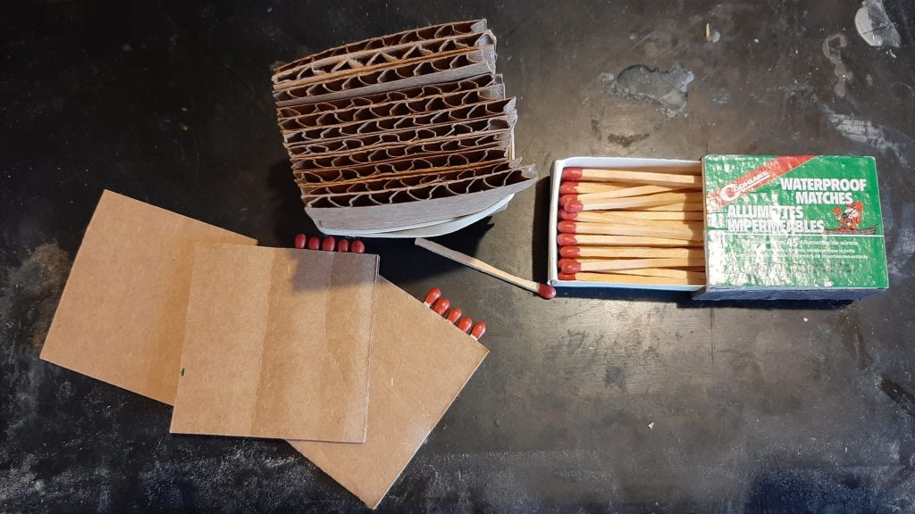 Il est important de joindre à votre lot d’allume-feu l’abrasif (en bordure de boite d’allumette) afin d’initier le tout par friction, bien entendu. Pourquoi ne pas ranger les deux au même endroit dans un sac refermable, prêt à servir en cas de besoin. Voilà!