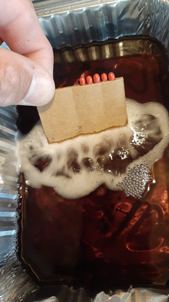 Vous insérez cinq allumettes côte à côte dans les espaces ondulés du carton jusqu’à la tête de celles-ci. Les têtes doivent rester exposées, car elles initieront le feu.