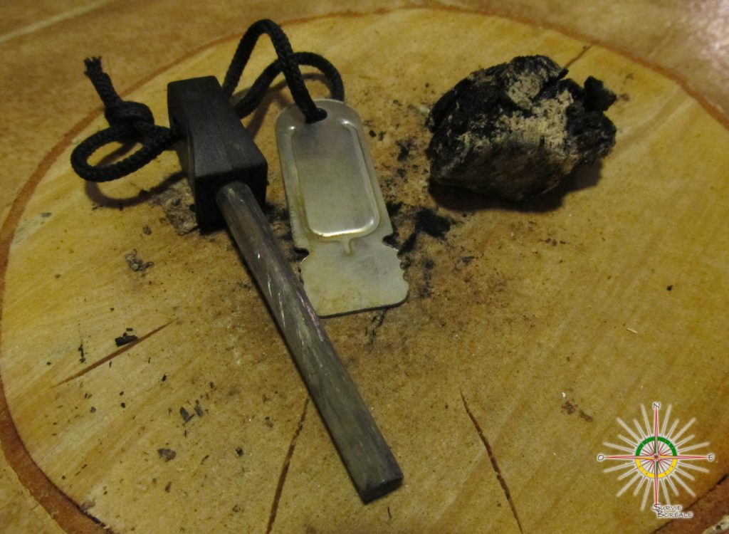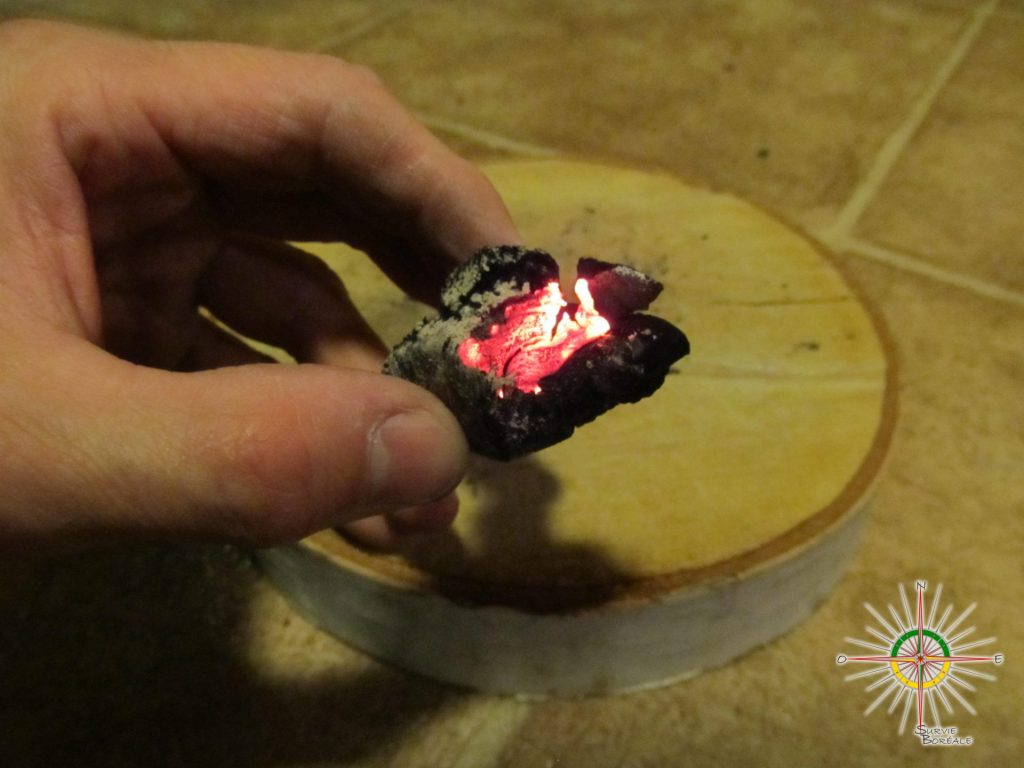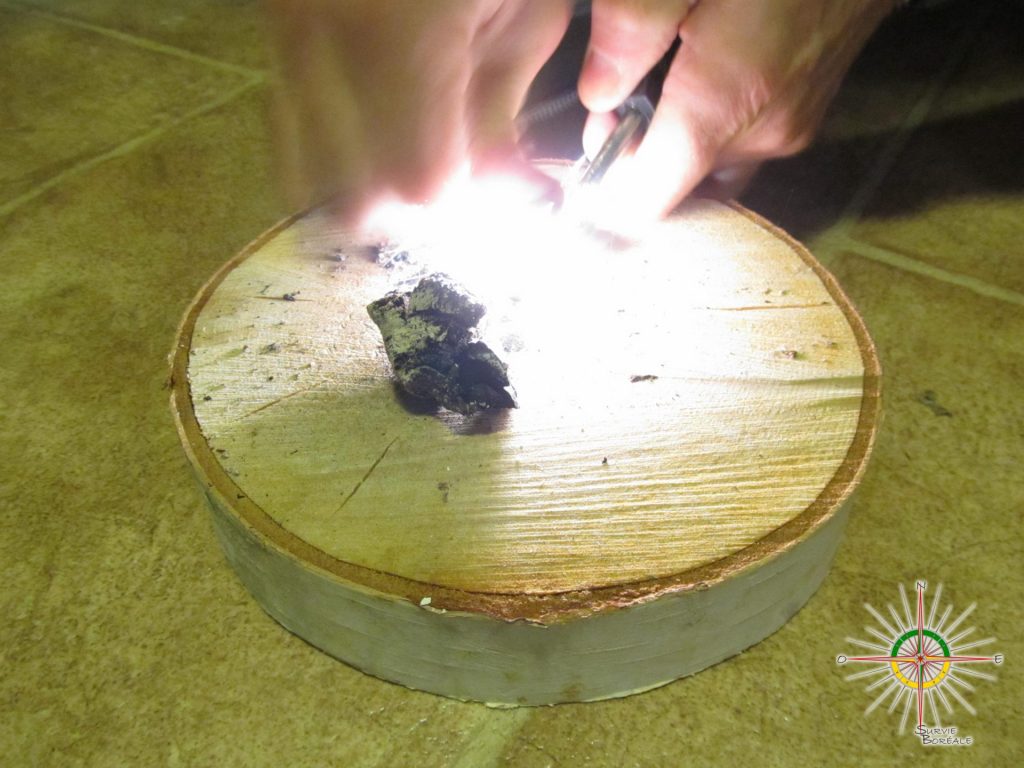 Si celui-ci est bien sec et que vous possédiez un allume-feu de type firesteel ça serait possible de le faire. L’étincelle créée, avoisinant les 3000 degrés Celsius, allumera le charbon produisant le tison tant souhaité. En alimentant le tison en air (en soufflant dessus) jumelé à un bon amadou vous pourriez ainsi créer le feu tant espéré!