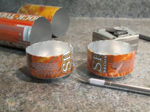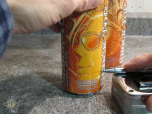 On marque la circonférence des canettes au crayon indélébile à égale hauteur (3cm aprox) pour ensuite couper celle-ci en suivant le trait de crayon. Notez bien ici que ce sont les fonds de canettes que vous aurez besoin pour la confection du brûleur.