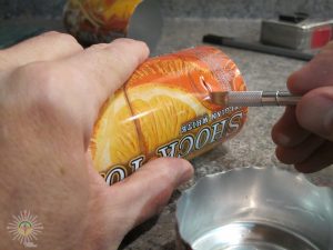 Percez ensuite le pourtour avec la punaise plusieurs petits trous séparés de 6 à 8 mm qui seront la partie échappement des gaz. Pour le remplissage, faites trois trous au centre du fond de la cannette. Voilà pour la construction….plutôt simple!