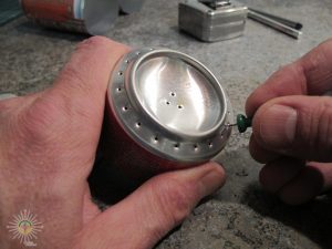 On remplit le brûleur d’hydrate de méthyle (50 ml) par les trois petits trous au fond de la cuvette qui est au-dessus. Avant l’allumage, il faudra préchauffer (10 secondes), avec votre briquet, le fond du brûleur pour créer des vapeurs inflammables à partir du combustible liquide.
