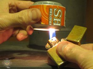 Essayez ça à la maison pour vous amuser… Voici les ingrédients. Deux canettes de bières vides, bien entendu… un crayon, un Exacto, Olfa ou une paire de ciseau, une punaise, de l’Hydrate de méthyle (alcool de bois) et un briquet.