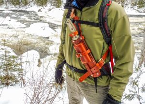 après…en cuir avec pochette à accessoire. Se porte à la ceinture ou à bandoulière sternale…