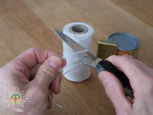 Laisser dépasser seulement un centimètre de la ficelle au-dessus du couvercle que vous allez avoir entré manuellement. Vous vous rendez compte à ce moment que la mèche siphonne l’huile par capillarité et que vous doigts sentent l’huile et le poisson…LOL!