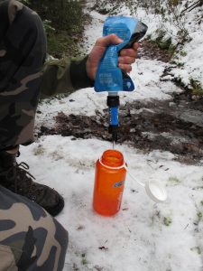 En effet, le Sawyer tout comme les autres filtres du genre sont sensibles au gel. L’eau passant de l’état liquide à solide gagne en volume et pourrait occasionner des bris à l’équipement en question. Alors voici quelques suggestions pour éviter que ce type de bris survienne sur le Sawyer. Après utilisation, agiter fortement le filtre en le tenant par l’une de ses extrémités pour en extraire l’eau accumulée. À la limite, soufflez dans l’une de ses extrémités si la première étape n’a pas fonctionné. Pour le remisage, si vous laissez le filtre dans votre sac à dos à des températures très basses, le résiduel d’eau pourra quand même faire des dommages. Alors il serait préférable de remiser celui-ci sur vous (dans un sac de type «Ziploc»), à la chaleur de votre corps. La petite dimension du Sawyer ne devrait pas entraver vos mouvements.