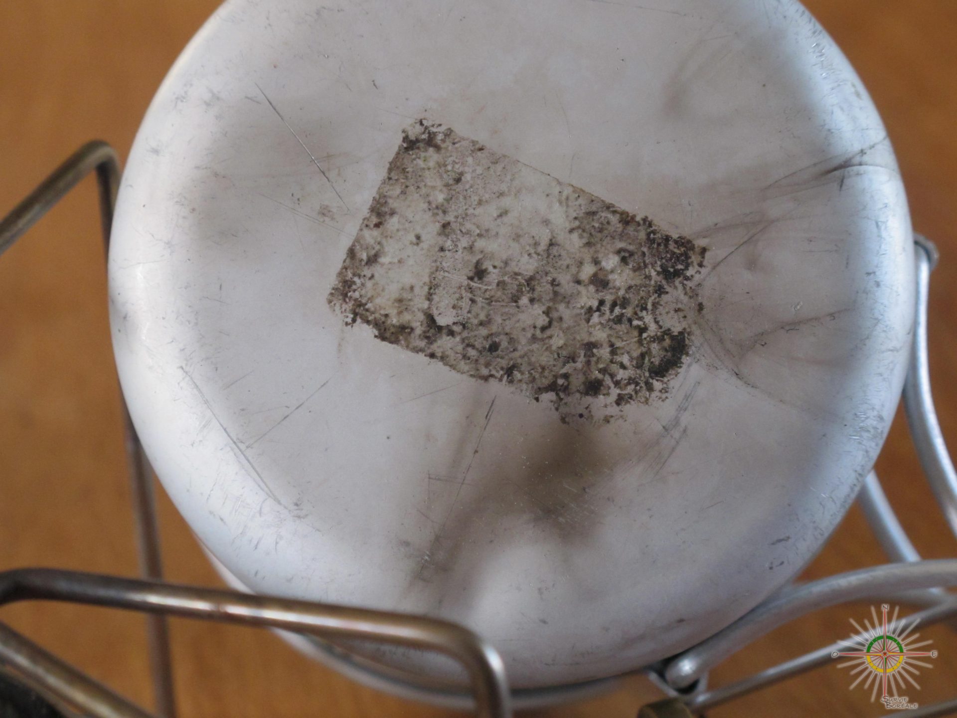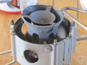 Combustion… Eh bien, je vous avoue que lors du préchauffage du réchaud un léger nuage de fumée noir s’est élevé pendant deux ou trois secondes avec l’essence ordinaire, suivi d’une odeur de combustion du style…échappement de voiture! Pendant la combustion, rien de particulier, ça brule sans broncher et sans signe de problème quelconque. À la fin on peut apercevoir de léger dépôt de suie noir sur le rebord de la tuilière du réchaud et sur le fond de la gamelle…