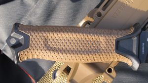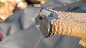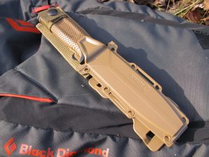 On retrouve au bout de celle-ci un trou pour une dragonne et un embout pointu pour marteler ou encore briser une vitre. L’étui fourni avec le Gerber StrongArm offre un système unique d’encliquetage du couteau et vous permettra de le fixer verticalement ou horizontalement où vous le souhaitez. Offert en noir ou coyote.