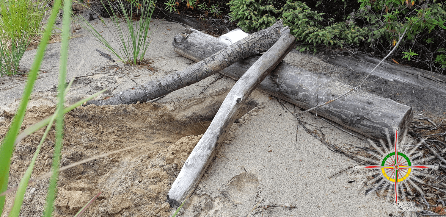 La première des choses, est de s’éloigner de tout cour d’eau d’une bonne cinquantaine de mètres afin d’éviter une contamination possible. Ensuite, on recherche un tronc d’arbre mort déjà au sol, une grosse pierre, un petit dénivelé où l’on va appuyer deux rondins (10 à 15 cm de diamètre selon votre poids) d’un mètre de long qui fera office de siège. Ils doivent être disposés comme un accent circonflexe (ou un « V » inversé), se touchant au sommet tout en s’écartant vers le bas.