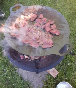 Pour faire suite à la publication de la semaine dernière, voici la deuxième de celles-ci, qui concerne la plaque de cuisson Petromax. Offerte en trois grandeurs (de 38, 48 et 56 cm), c’est une plaque d’acier forgé, légèrement concave, que l’on dispose au-dessus de son feu de bois ou de gaz afin de la chauffer et de cuisiner dessus. Pour les friands Marvel, ça ressemble drôlement au bouclier de votre héros préféré. Mais, sans l’étoile…