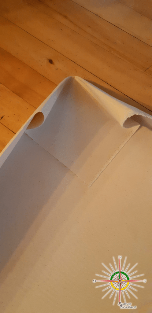 J’ai ensuite cousu ces ourlets (couture double) pour pouvoir y glisser des perches ou y passer une corde. Le produit final a une dimension de 1,5 m (59 po)X 80 cm (31.5 po). Ahhhh, vous voyez maintenant ou je veux en venir…