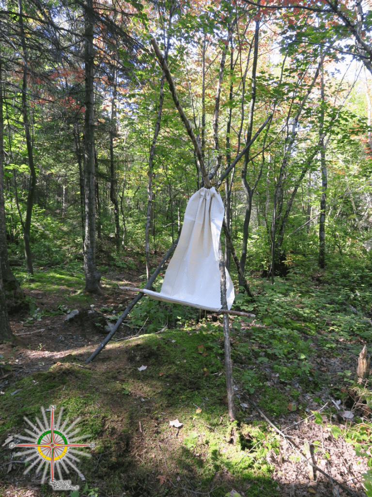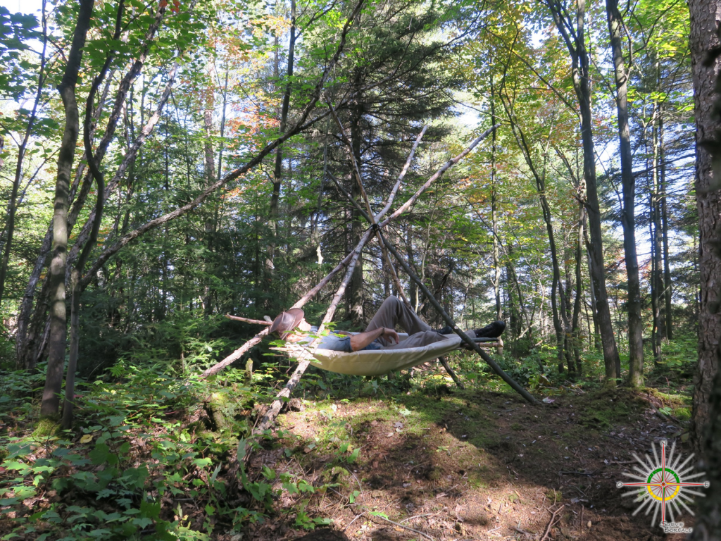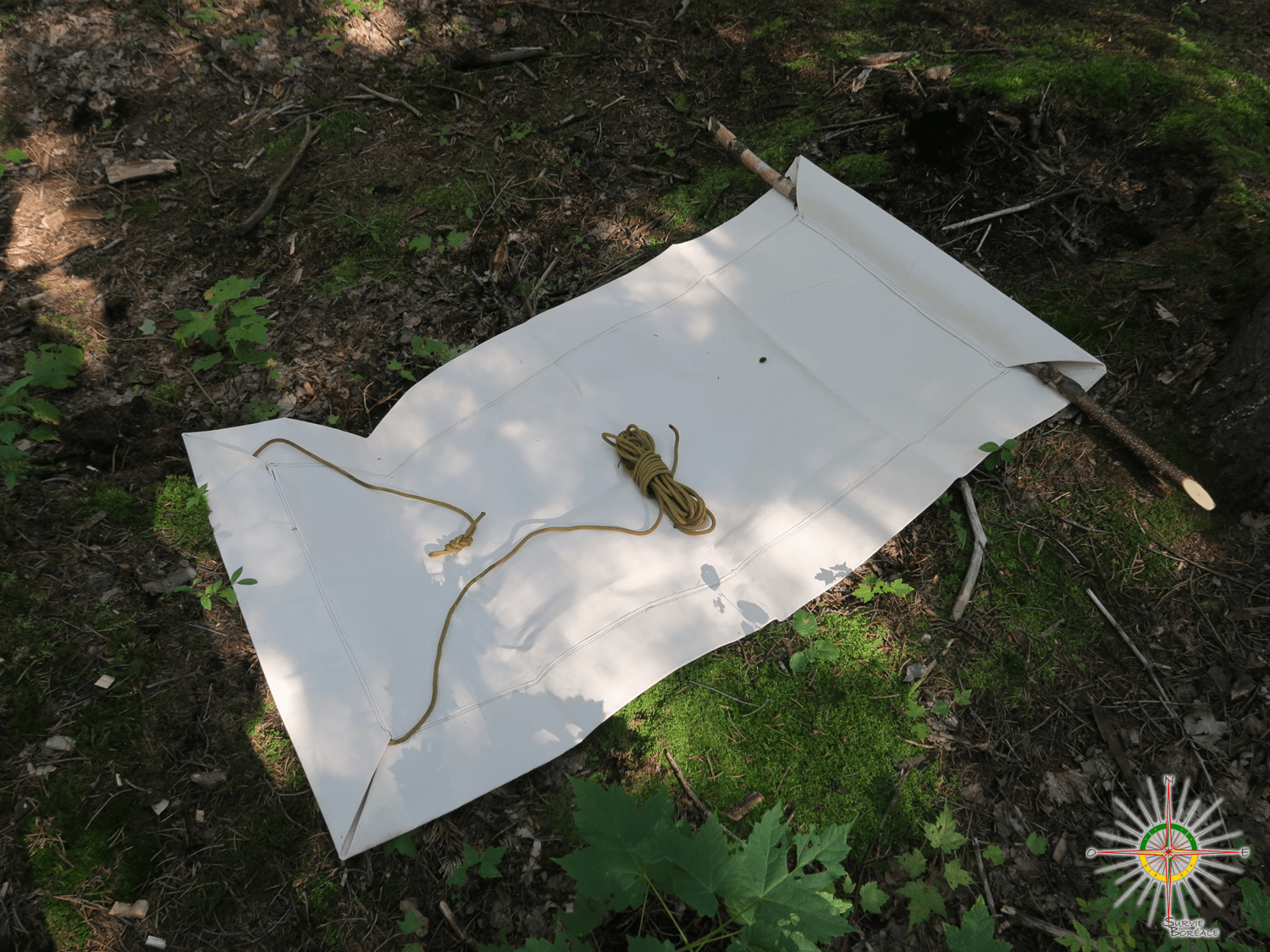 Le lit de camp : On passe des bâtons dans tous les ourlets pour que ceux-ci dépassent de 30 cm le canevas. On dépose les extrémités sur un quadripode préinstallé pour que le canevas soit sous tension. Un ajustement des pattes s’impose à ce moment pour que le tout soit bien appuyé. Et voici le lit de camp. Il pourrait même, à la limite, remplacer la fameuse technique du banc de parc si on installait le tout près d’un feu…