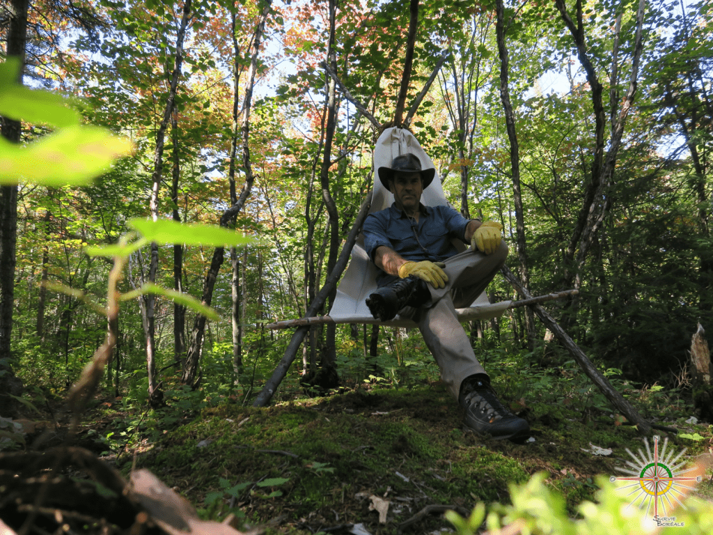La chaise : À l’une des extrémités du canevas, on passe une corde dans l’ourlet et à l’autre un bâton de un mètre (3 cm de diamètre). On accroche le cordage à un trépied préalablement installé et ajuste l’écart des pattes pour qu’appui le bâton glissé dans le canevas. Voilà pour la chaise très confortable.