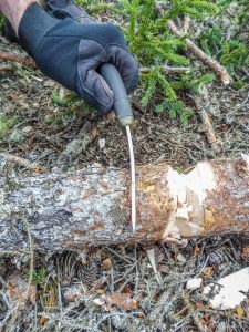 Ça tranche solidement!!! J’ai fait des copeaux avec de l’épinette noir comme si je tranchais du beurre. Je lui ai tapé dessus avec un gourdin pour l’enfoncer dans cette même épinette de 7,5 cm (3’’) jusqu’en son cœur. Je l’ai ensuite enfoncé de la même manière pour le plier et le tordre généreusement…Je lui ai enfoncé sa pointe sur le tiers de la longueur en tapant avec le gourdin sur sa poignée pour encore une fois le plier en me disant que quelque chose allait péter…J’ai continué à le tordre en faisant des spirales avec sa pointe et rien ne s’est passé….il a juste tout bonnement couper sans se plaindre….Bravo!