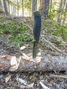 Bon, les particularités du model essayé. Le « compagnon robust » a une lame d’une longueur de 10,4cm (4 pouces) et de 3,2mm d’épaisseur en acier au carbone. Son poids est de 135g et sa longueur total 22,4cm. Le tranchant de type scandinave de la lame a un angle de 27 degrés qui est plus obtus que la plupart des Mora. Le dos de la lame a une finition ronde et douce qui devient un défaut lors de l’utilisation d’un firesteel….Disons que ça manque de mordant! Donc, quelques coups de lime seront à prévoir pour corriger ce petit désagrément.